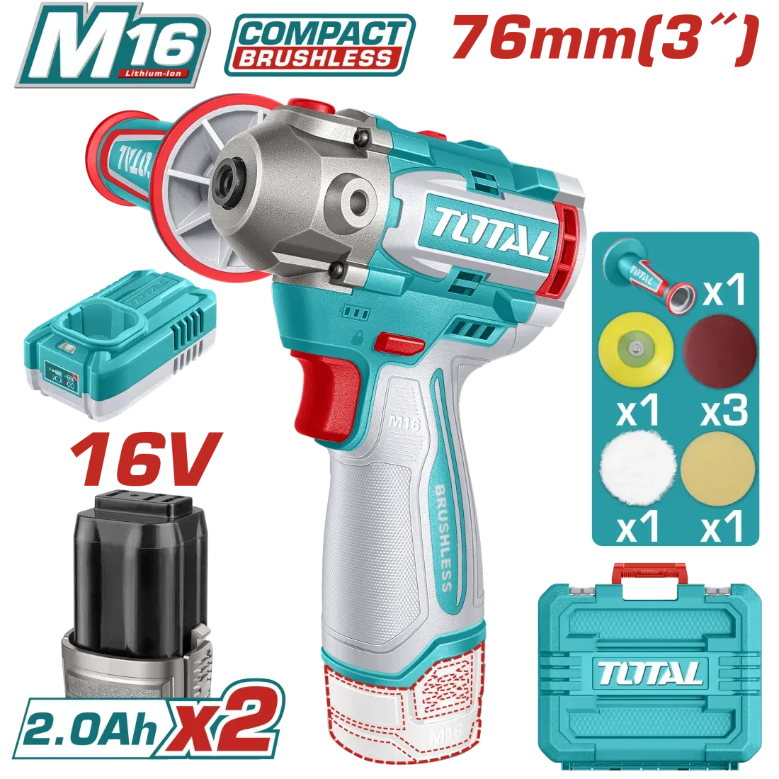 Pulidora 16V BL 76mm INDUSTRIAL TOTAL TAPLI1676-4 (MALETIN, CARGADOR, Y 2 BATERIAS)