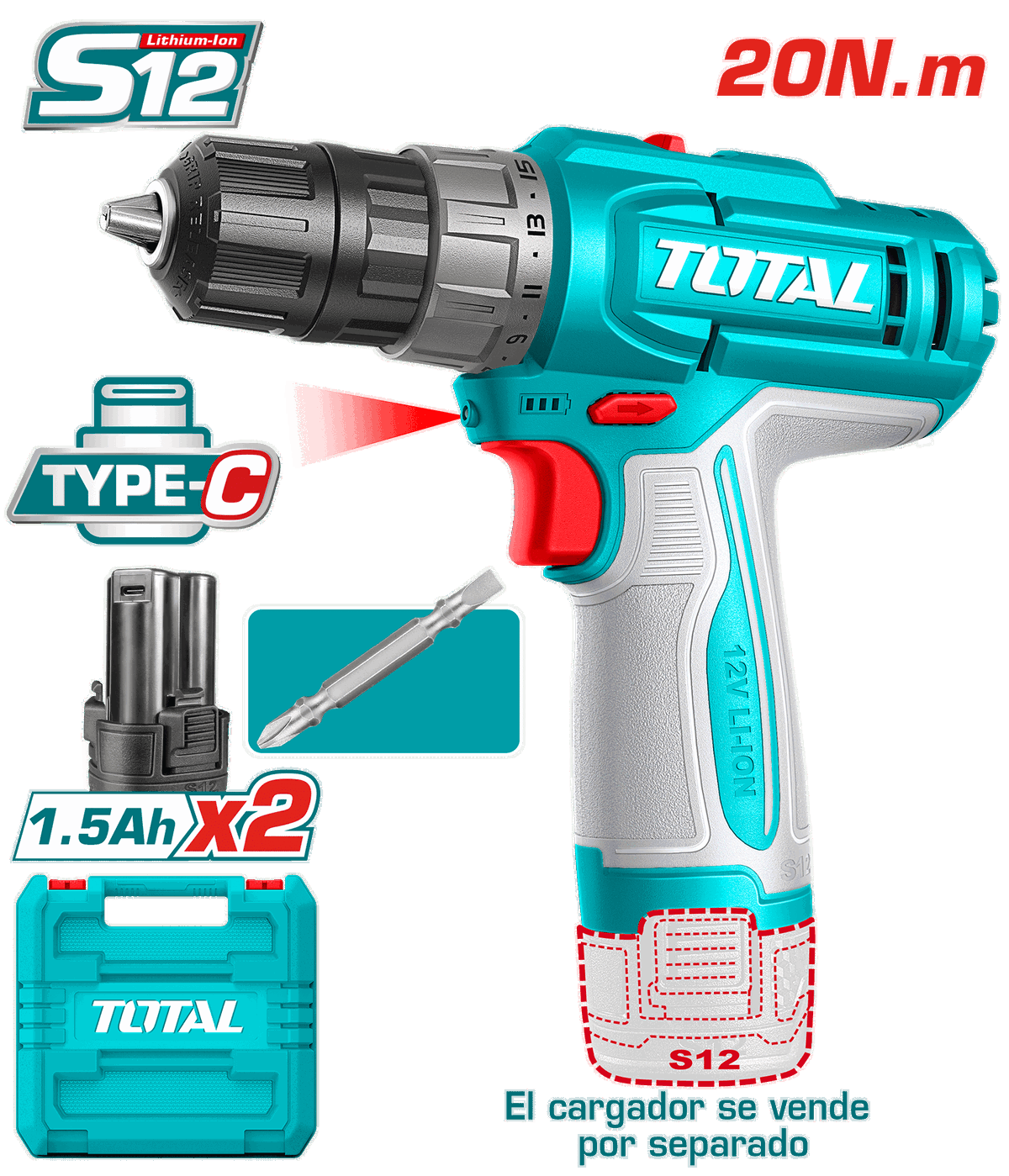 Taladro 12V 1500rpm 20Nm TOTAL TDLI12206 (MALETIN Y 2 BATERIAS CARGA TIPO C)