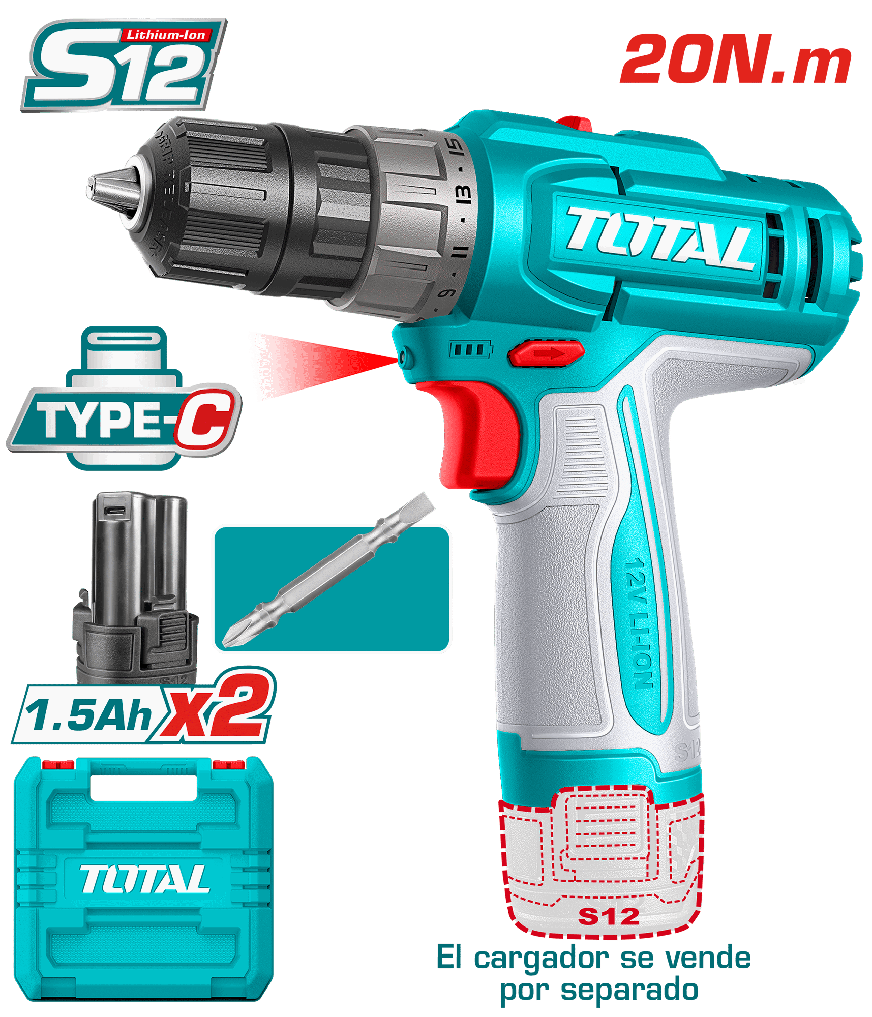 Taladro 12V 1500rpm 20Nm TOTAL TDLI12206 (MALETIN Y 2 BATERIAS CARGA TIPO C)